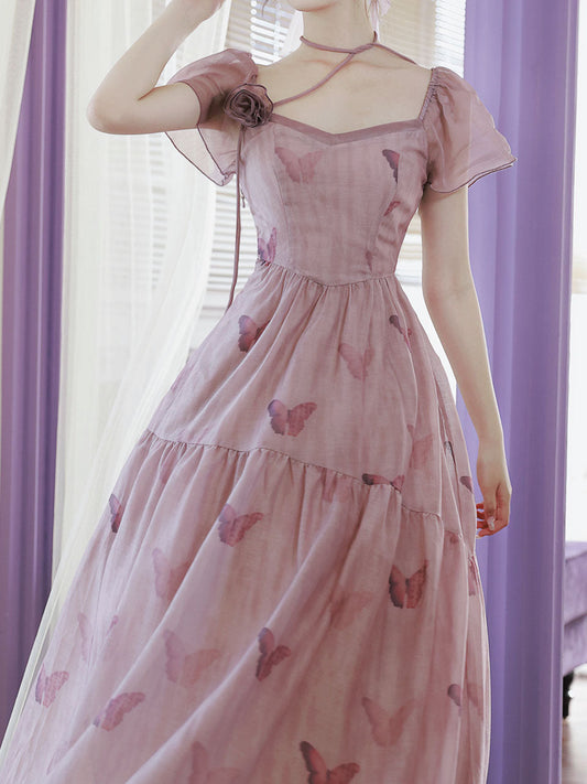 Lilac Purple Butterfly Print Romantic Maxi Dress
