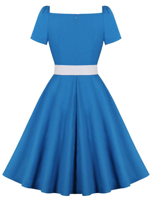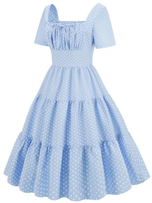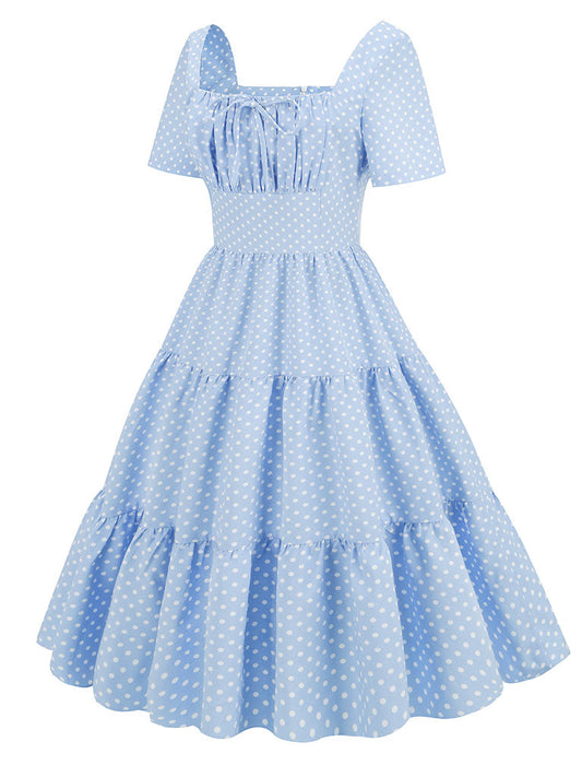 Light Blue Polka Dots Square Collar 1950S Vintage Swing Dress