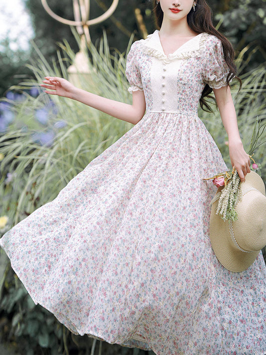 Pink Lace Floral Print Puff Sleeve Fairy Corecottage Dress