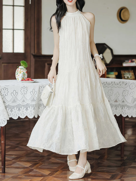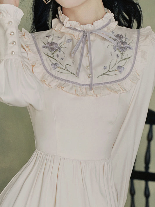 White Peter Pan Collar Long Sleeve Vintage Embroidered Cottagecore Cotton Dress
