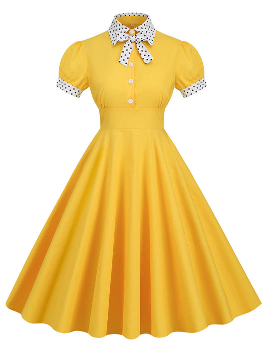 Yellow Polka Dots High Waist Audrey Hepburn Style Cocktail Suspender Swing Dress