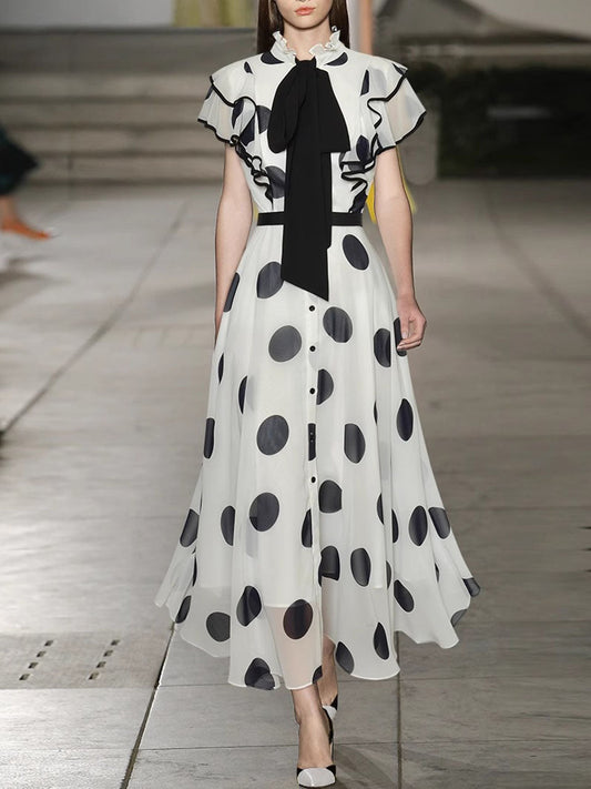 White Victorian Polka Dot Stand Collar Bow Ruffle Short Sleeve Vintage Dress