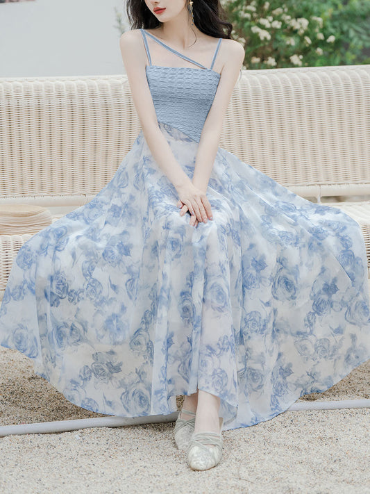 2PS Blue Floral Print Spaghetti Strap Dress With Blue Shawl Dress Suit