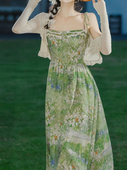 2PS Green Floral Print Suspender Print Vintage Dress and Cardigan Suit