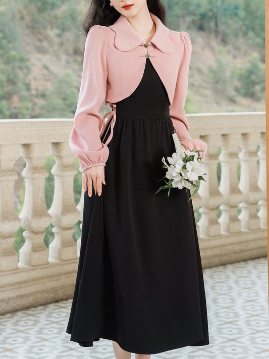 2PS Pink Long-sleeved Short Coat And bBlack Suspender Dress Set