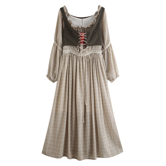 2PS Pink Ruffles Shirt and Plaid Brown Swing Skirt Suit Women Vintage Medieval Victorian Dress