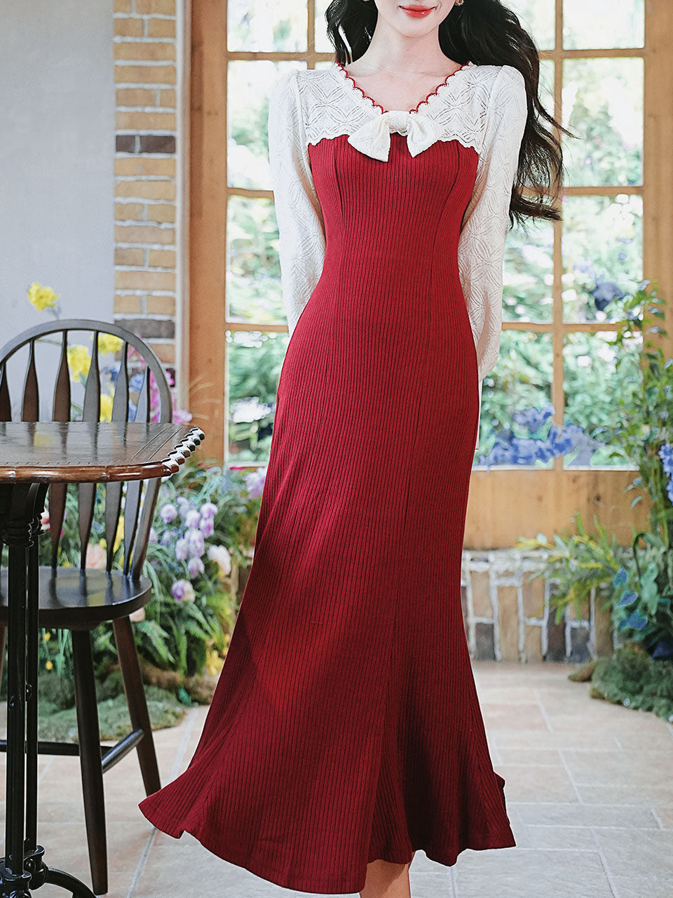 1940S Red High Waist Knitted Sweater Long Sleeve Vintage Dress