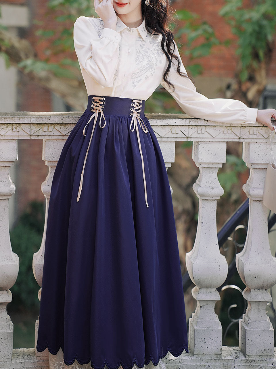 1950S Vintage Embroidered Puffed Sleeve Shirt And Swing Skirt Set