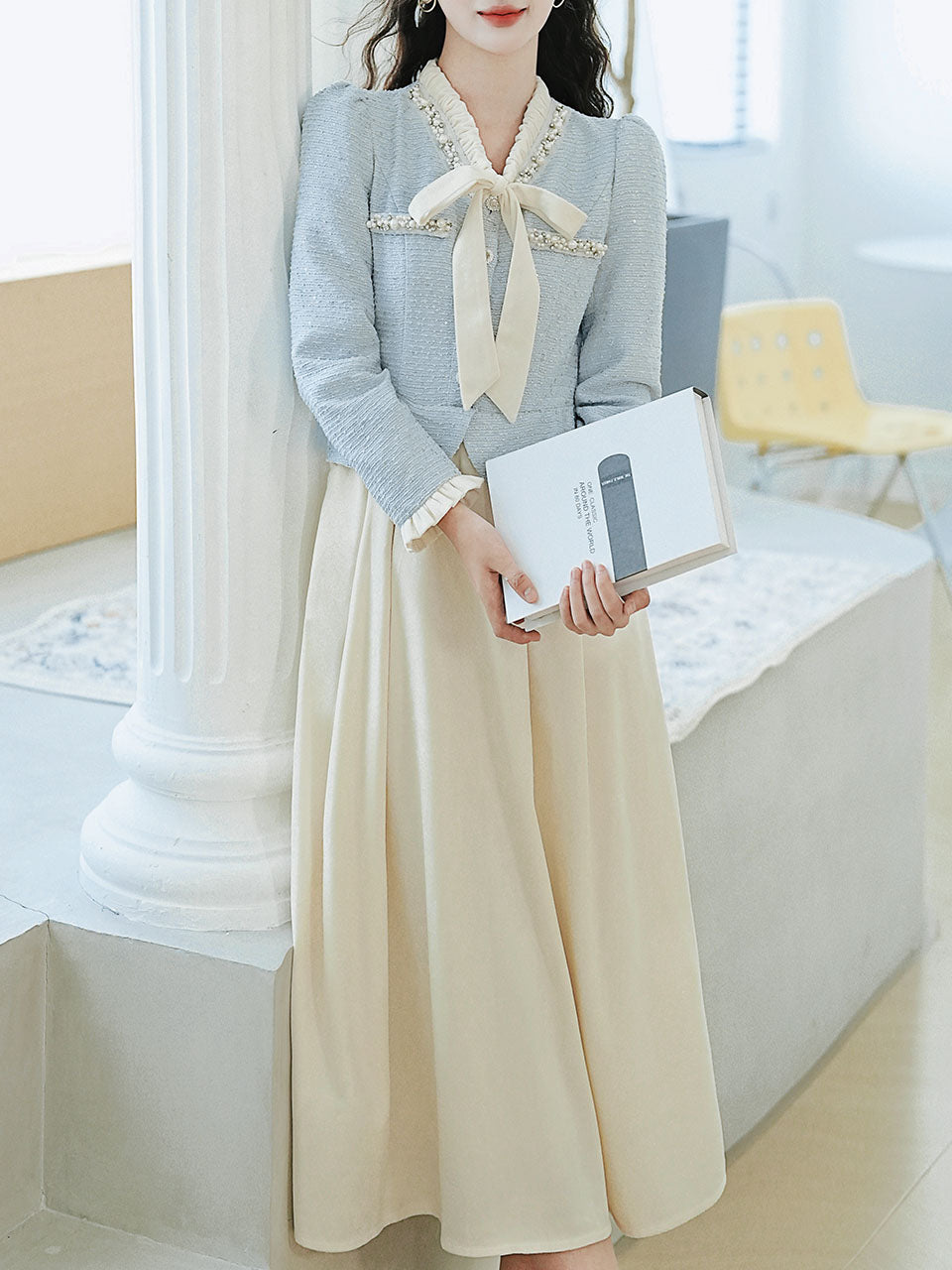 2PS White and Blue Tweed Coat With Swing Skirt 1950S Vintage Audrey Hepburn's Style Outfits
