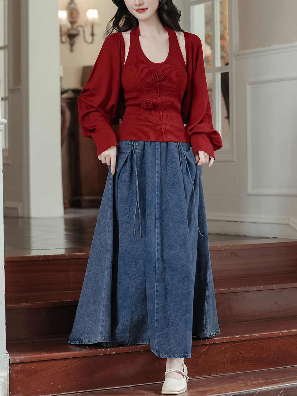 3PS Red Rose Vest And Denim Skirt 1950s Suit Vintage Audrey Hepburn's Style Outfits