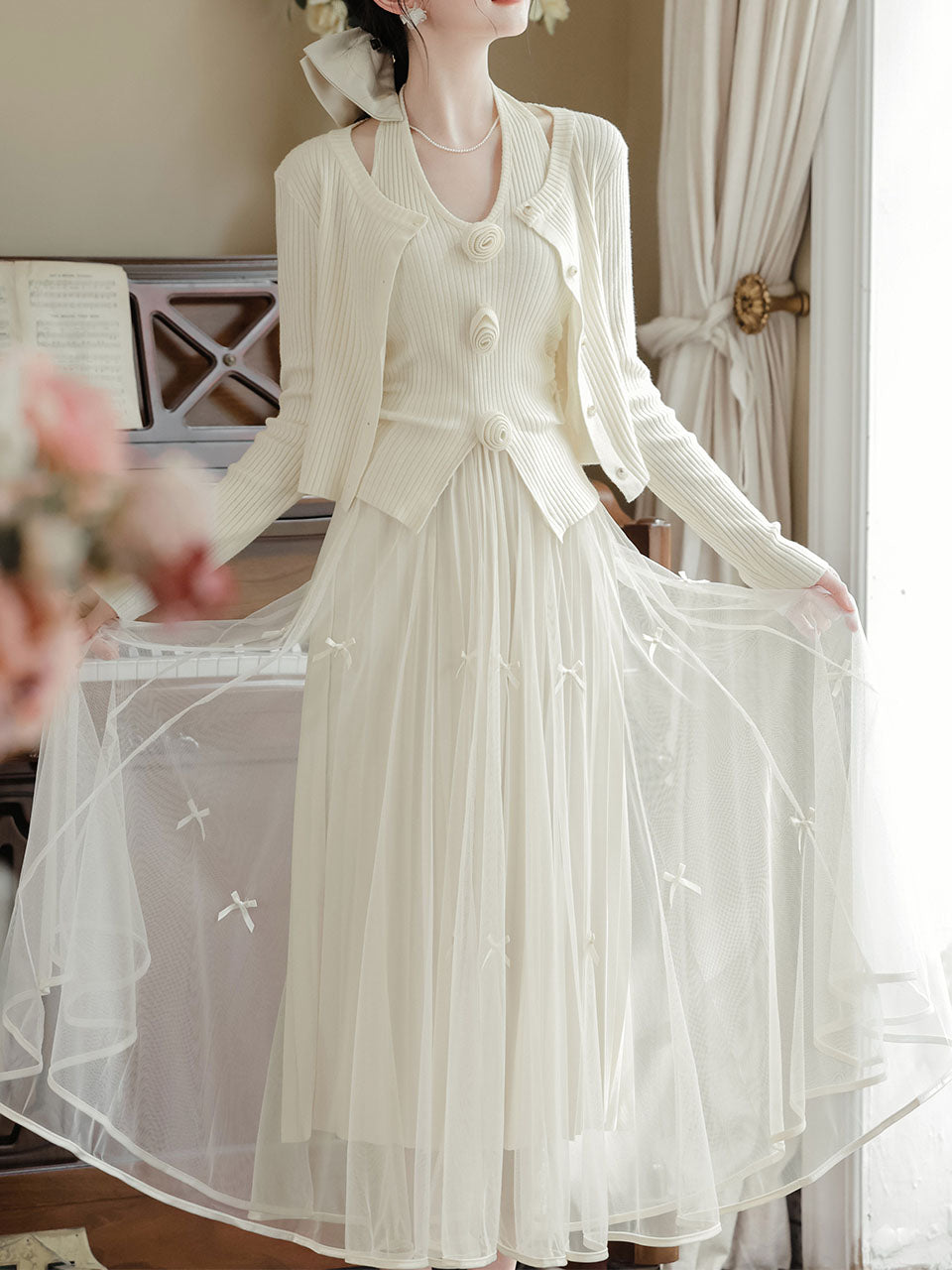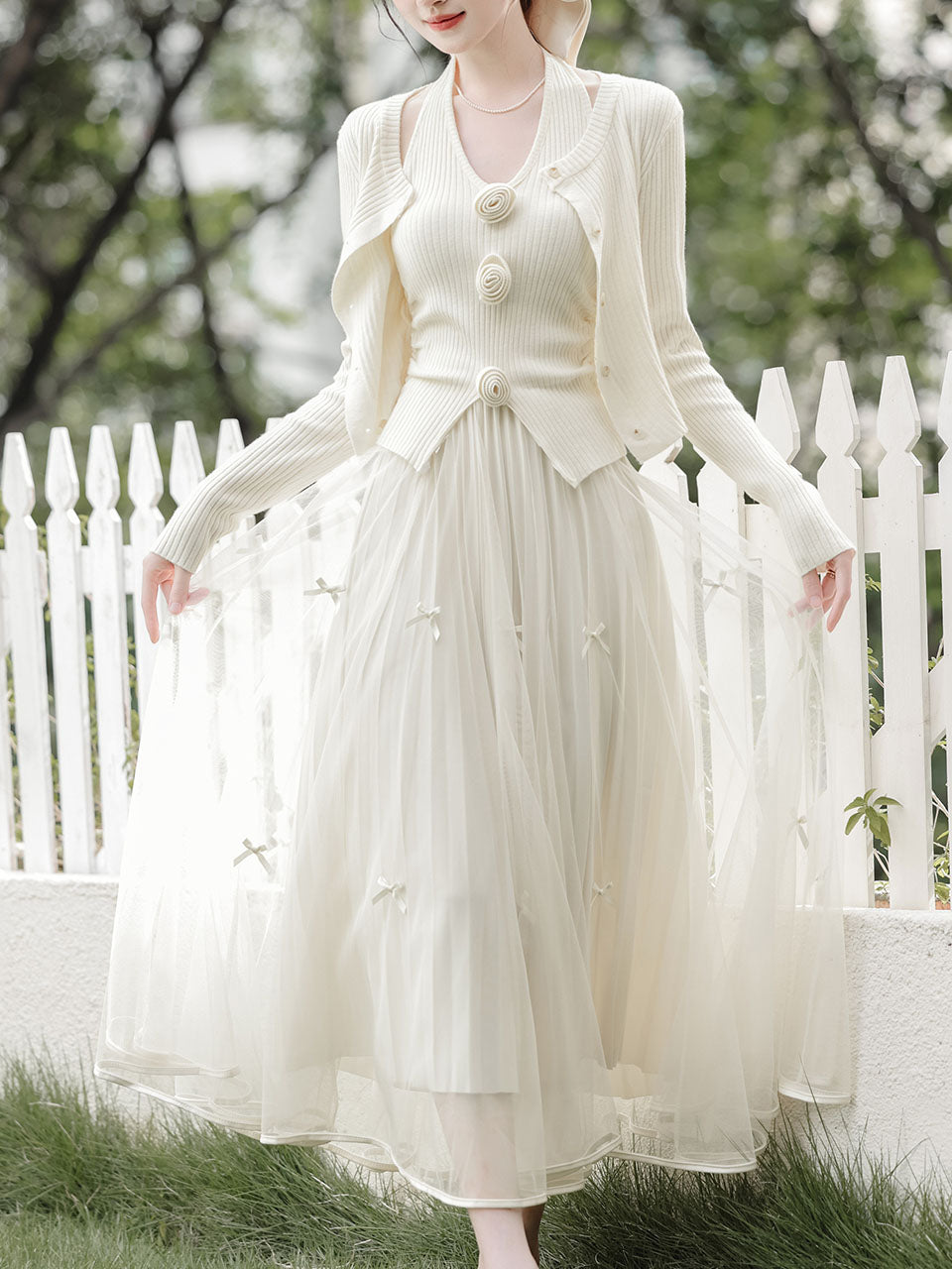 3PS White Rose Vest And Swing Tulle Skirt 1950s Suit Vintage Audrey Hepburn's Style Outfits
