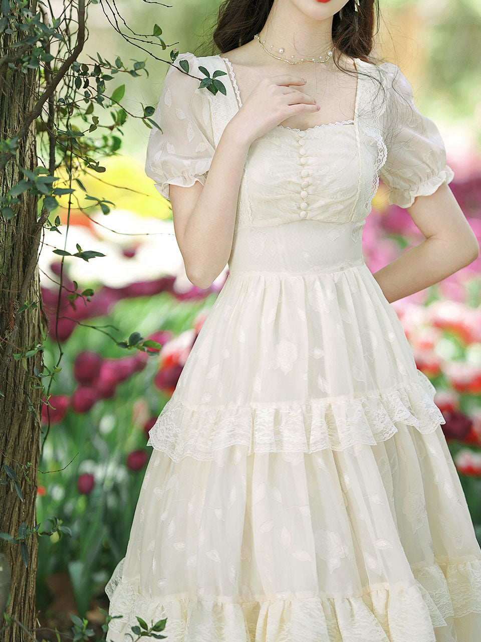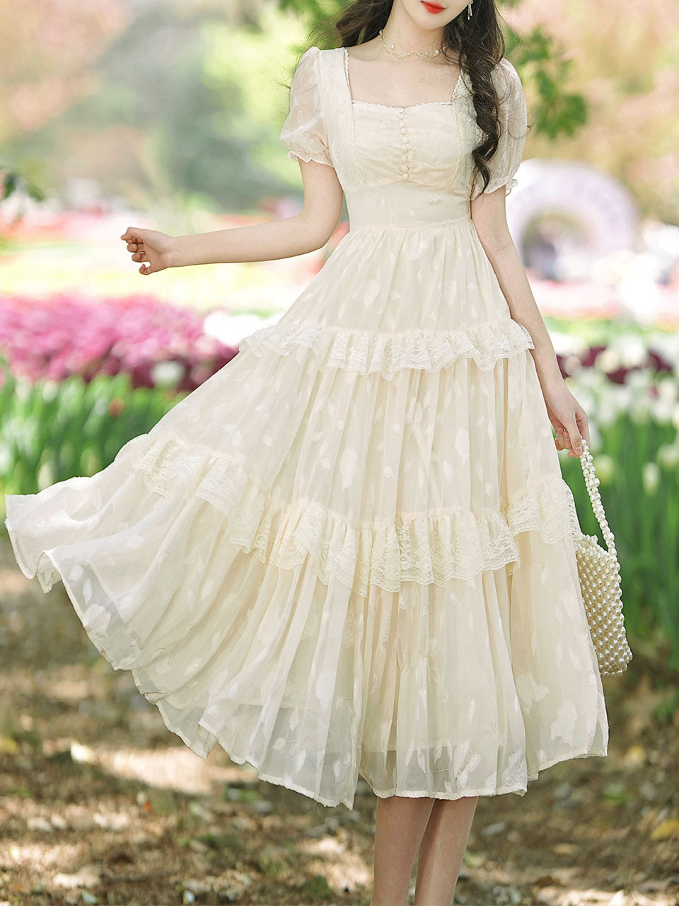 Apricot Square Neck Lace Puff Sleeve Vintage 1950S Dress
