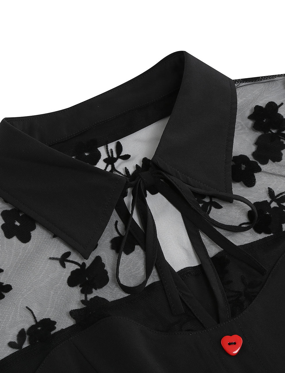 Black Peter Pan Semi Mesh Flower Short Sleeve 50S Swing Dress