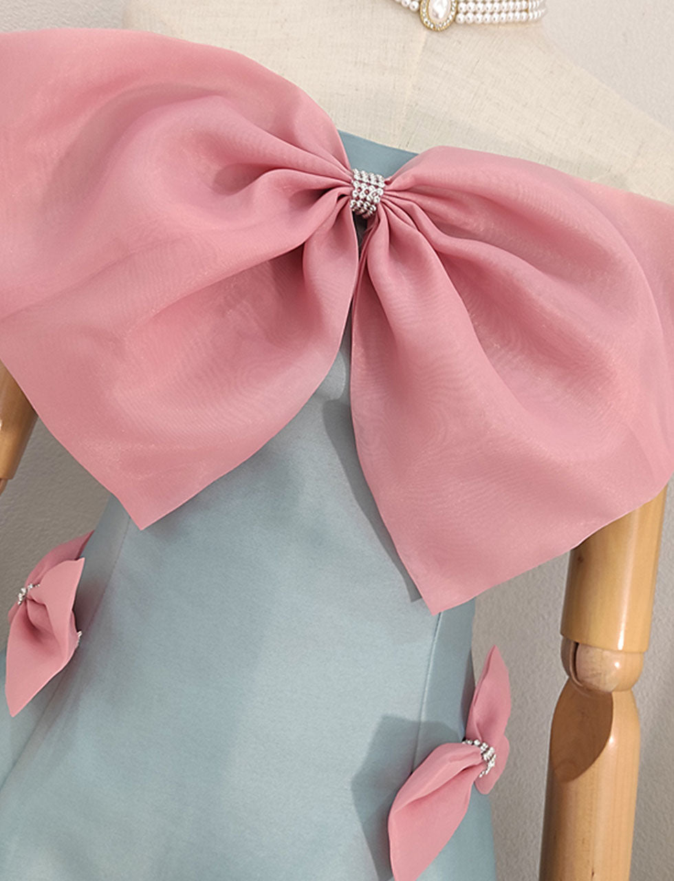 Blue Bow Off The Shoulder Tube Gown Party Dress