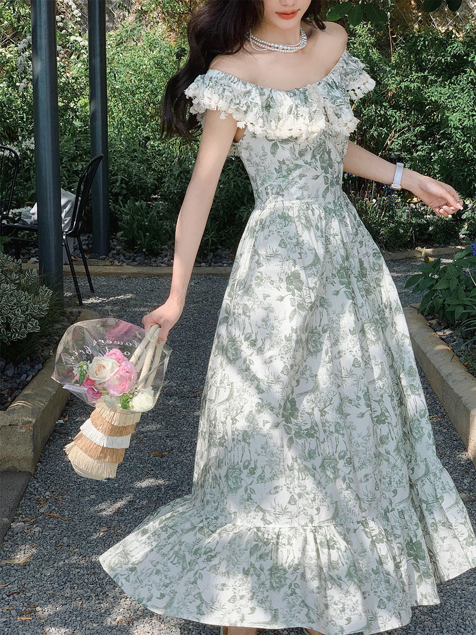 Green Floral Print Off Shoulder 1950S Vintage Dress