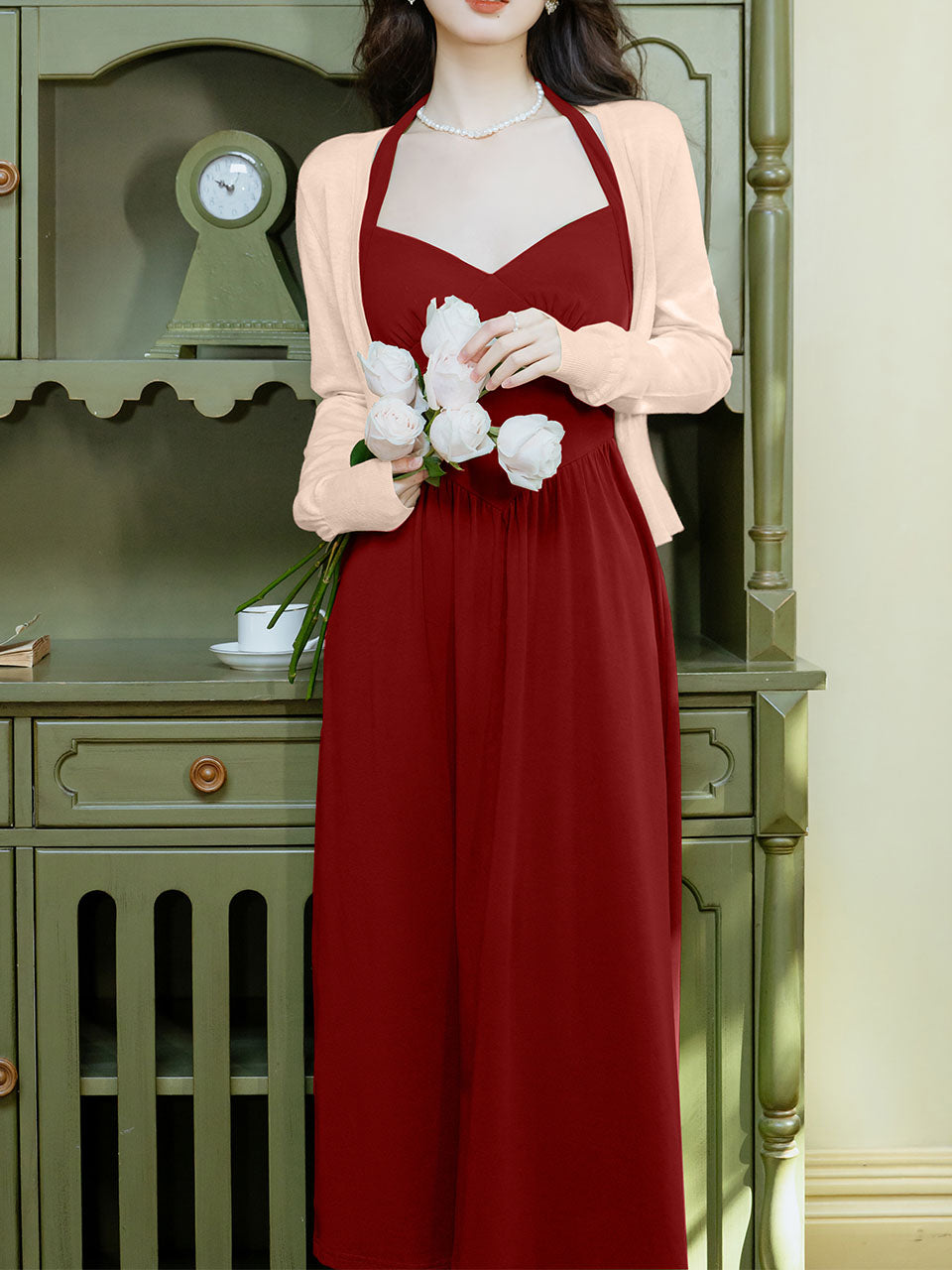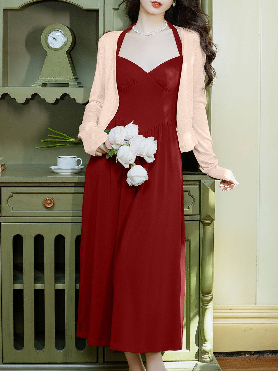 Green Halter Backless Vintage Dress Prom Dress With Short Cardigan