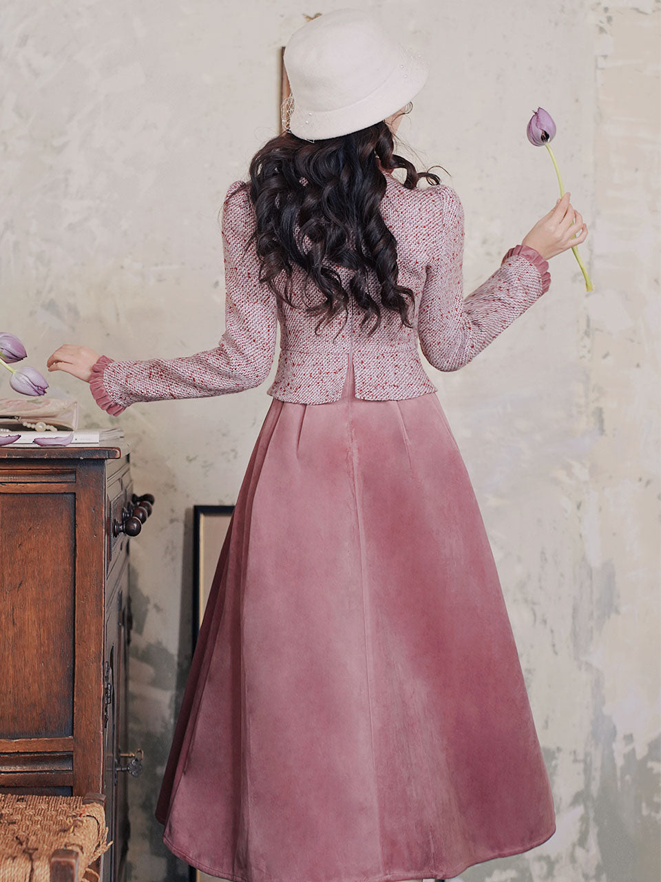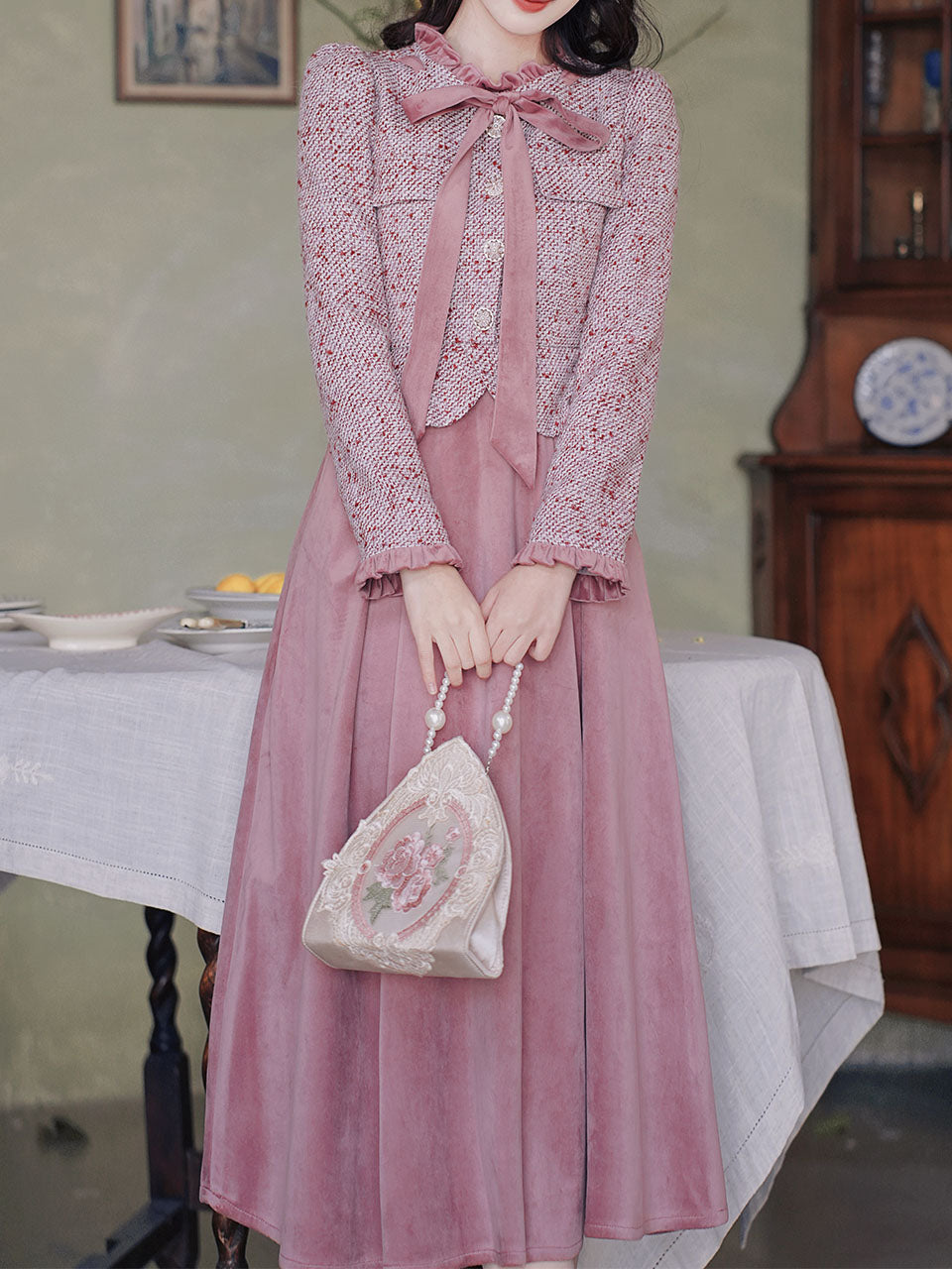 Pink and Purple Bow Fake Two-piece Velvet Long Sleeve Vintage 1950S Swing Dress
