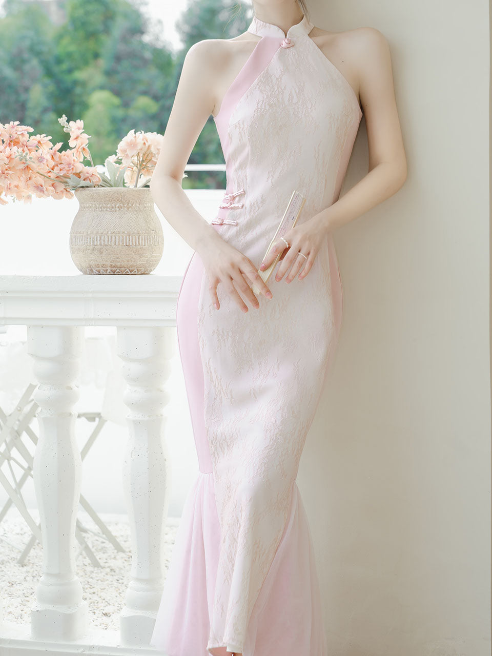 Pink Cheongsam Fishtail Maxi Dress Prom Dress With White Cape