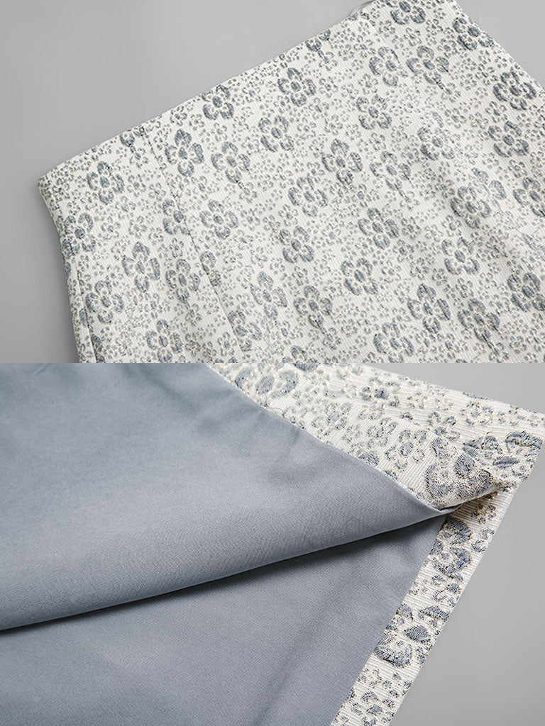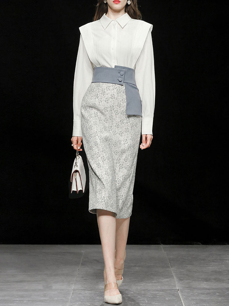 2PS White Vertical Stripes 1950S Vintage Classic Top And Blue Floral Print High Waist Skirt Suit With Belt